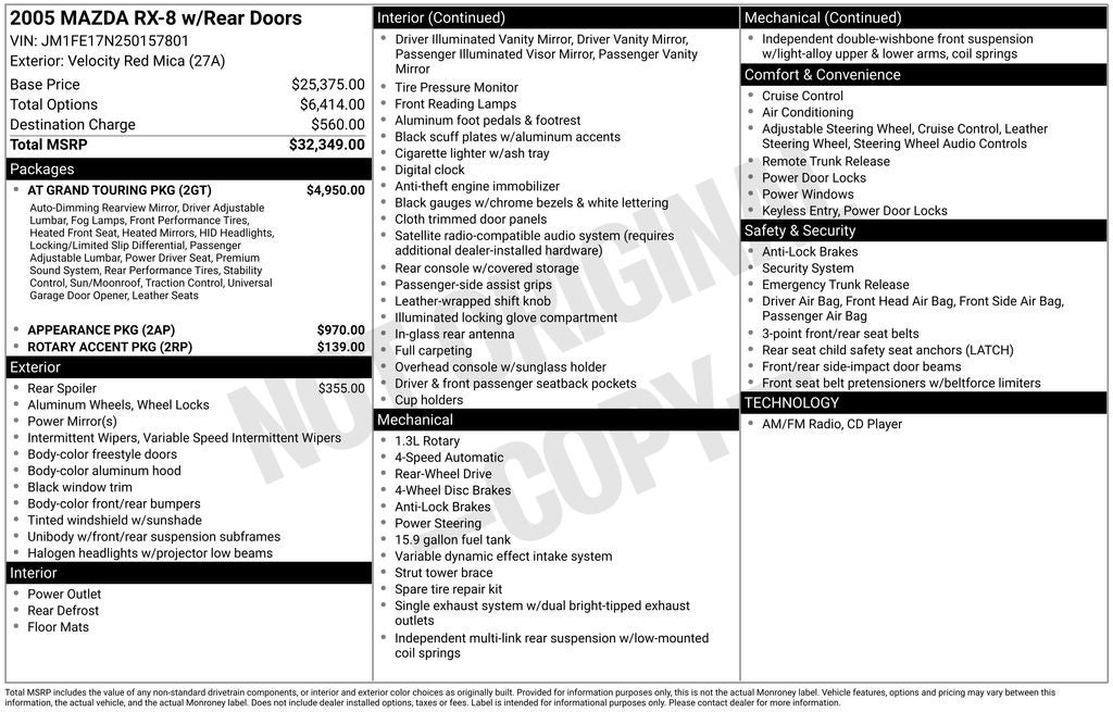 Beyond the dynamic driving experience, this RX-8 Sport is equipped with a wealth of premium features that elevate your ownership experience. The AT Grand Touring Package includes Xenon headlights, a Bose audio system, a power moonroof, and leather-trimmed upholstery, creating a truly luxurious ambiance. The Rotary Accent Package adds a touch of style with polished rotary accents, while the rear wing spoiler enhances the sporty aesthetic.