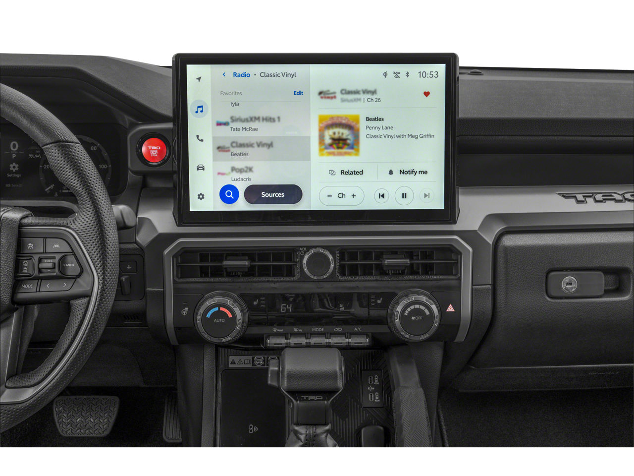 - TRD Off-Road Upgrade Package, including an integrated trailer brake controller, heated leather-wrapped steering wheel, Qi-compatible wireless charging, and much more
